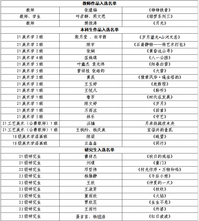 学生作品方面,来自21级美术学2班、21级美术学4班、21级美术学5班、21级工艺美术公费职师1班等多个班级的本科生,以及21级、22级、23级的研究生均有作品入选,共计27件,学生在艺术创作方面的能力得到进一步提升。