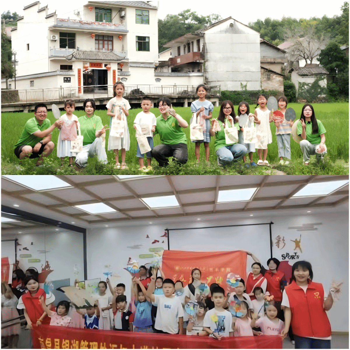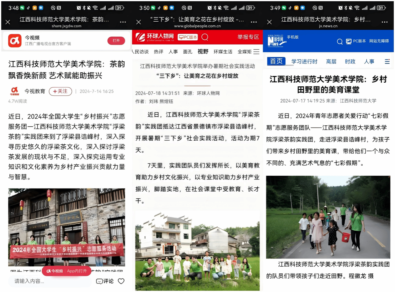 积极响应“三下乡”社会实践的号召,以美育教育助力乡村文化振兴,在基础实践中受教育、长才干、做贡献。组织“赣韵飘香-浮梁茶韵”和“非遗蓝晒绘就美育童心”两支队伍分别入选2024年全国大学生“乡村振兴”志愿服务团和2024年青年志愿者关爱行动“七彩假期”志愿服务团,于2024年7月前往景德镇诰峰村开展三下乡社会实践活动,实践事迹被新华社、环球人物网、大江网、江西广播电视台、江西晨报等十余个国家级、省级媒体报道,团队获评三下乡校级“优秀团队”称号,个人获评校级三下乡实践“优秀个人”称号,作品《田野里的美育课》入选2024年江西省高校青年志愿服务摄影作品。