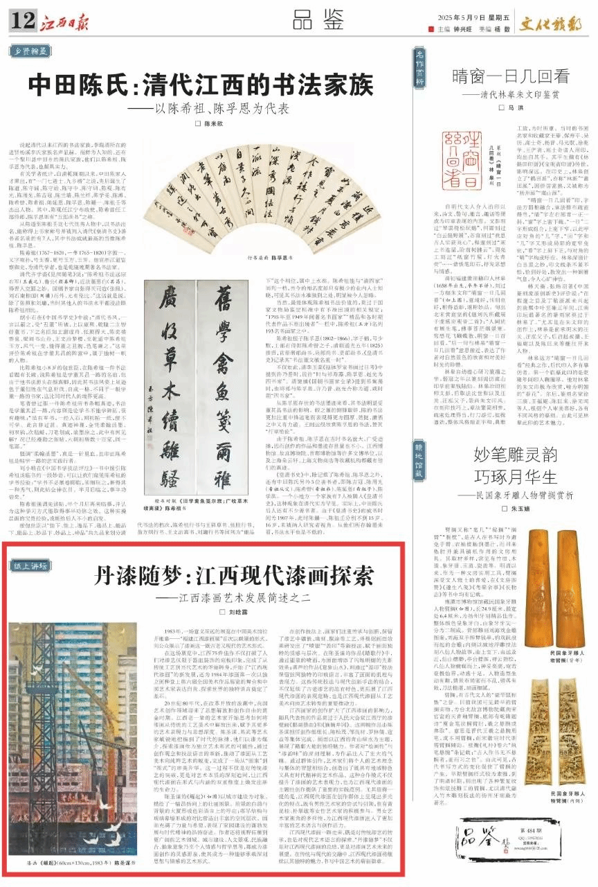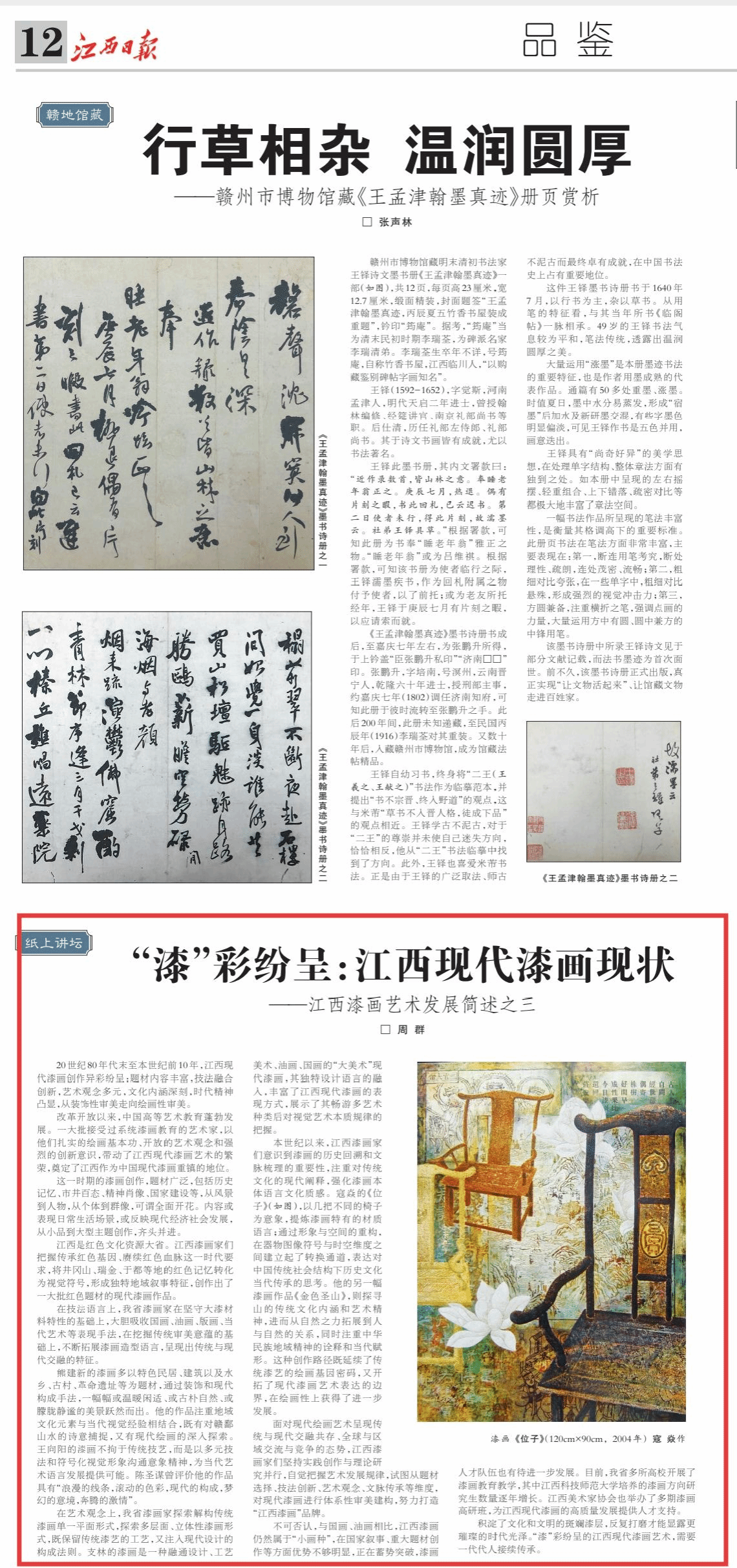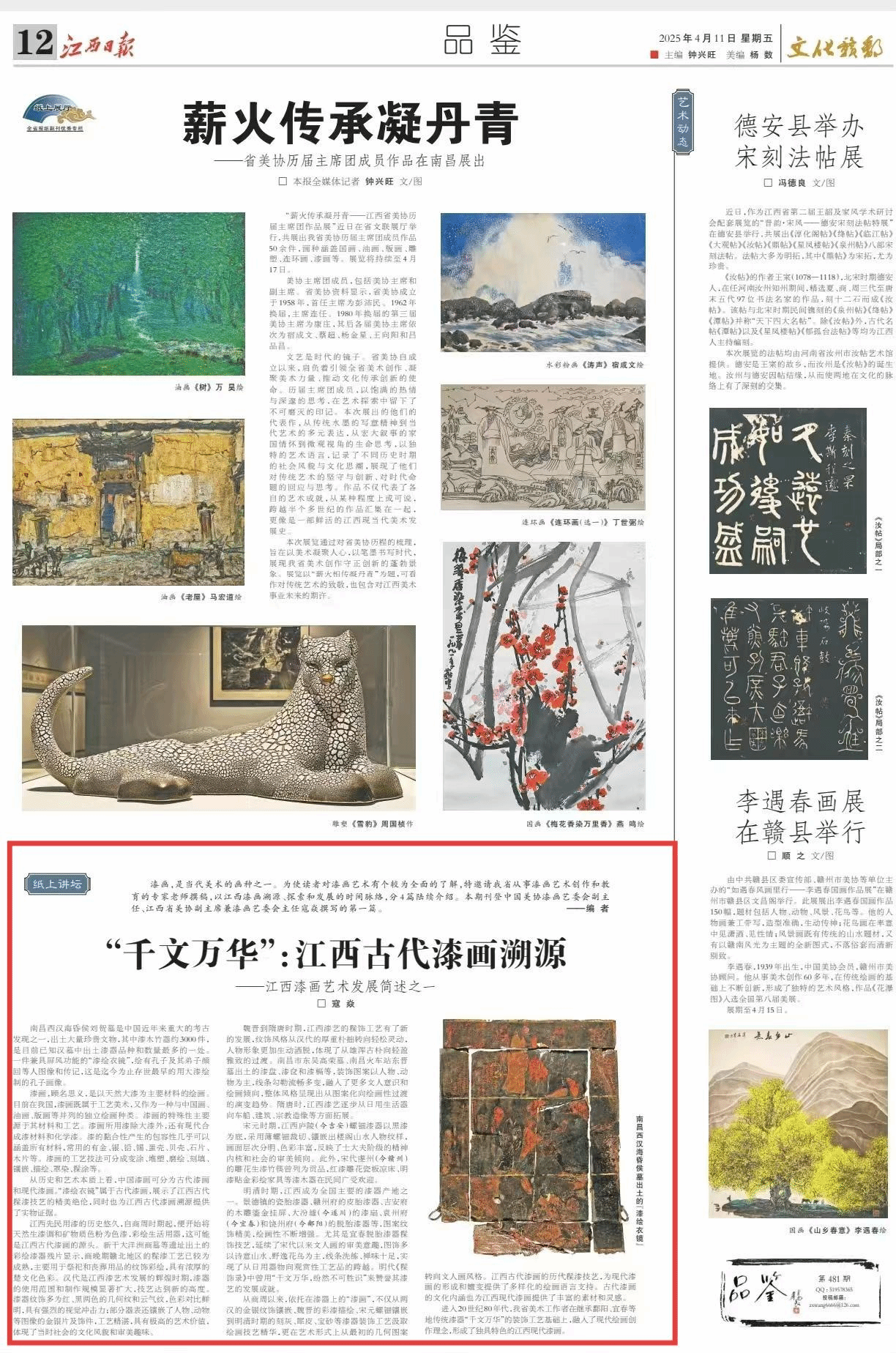 近日,《江西日报》刊发WilliamHill威廉希尔漆画研究团队寇焱、刘晗露、周群、吴俊分别撰写的《“千文万华”:江西古代漆画溯源》《“丹漆随梦”:江西现代漆画探索》《“漆”彩纷呈”:江西现代漆画现状》《未来可“漆”:新时代江西漆画笃定前行》四篇文章。