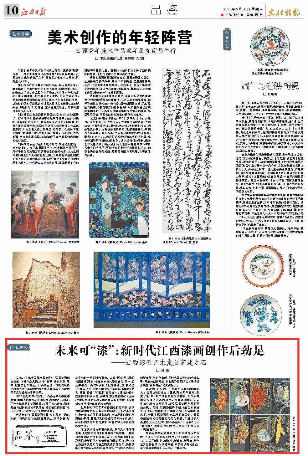 《未来可“漆”:新时代江西漆画笃定前行》展望了江西漆画的未来。文章指出,新时代江西漆画以“红色历史、绿色生态、传统文化”三大主题守正创新。罗文娟《平实·今意》以农物符号隐喻红土地精神,复合透视技法拓展空间维度;我省青年画家在2024年度全国美展斩获7件“进京作品”,《熙来攘往烟火间》《聚焦华彩》等诠释新时代人文生态。通过“全国小幅漆画展”等平台,江西正以地域叙事打造“赣派漆画”文化标识。