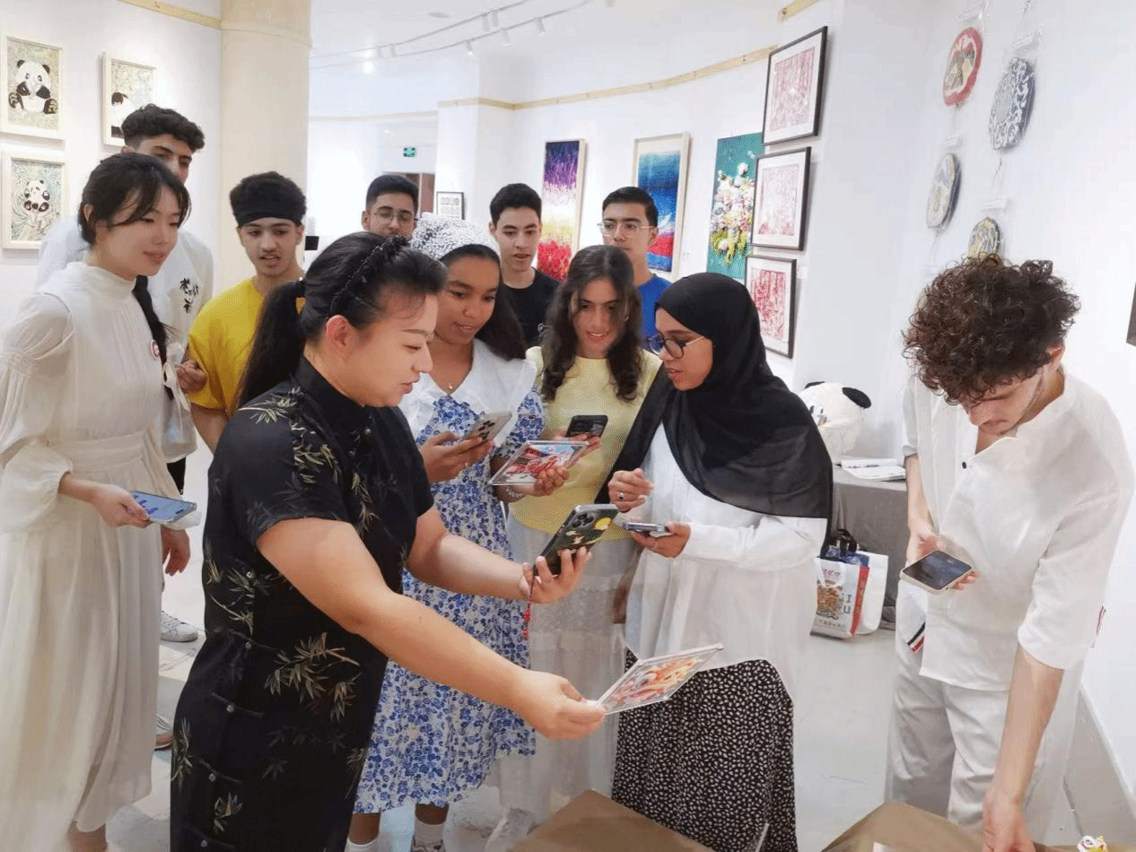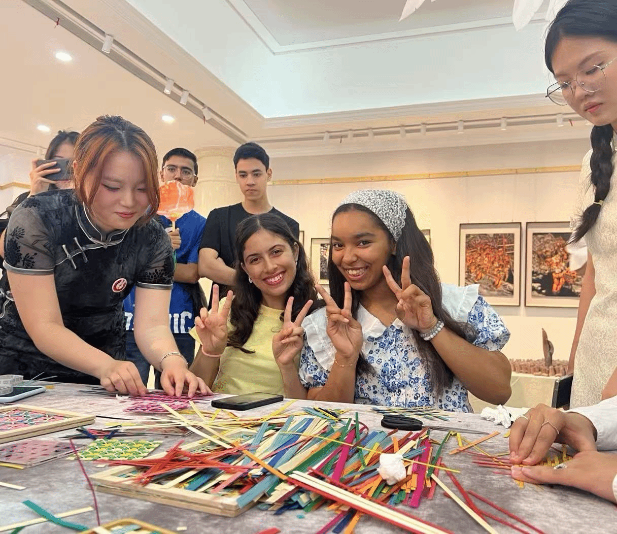 展览期间,学校品牌项目“美术馆里的美育课”实现全新升级,成为中外文化交流的新平台。在省级红色实践团队成员的指导下,来自摩洛哥等国的留学生现场体验了井冈山竹编技艺。通过“边看边学、动手体验”的沉浸式教学,留学生们在竹篾翻飞间感受中华传统工艺魅力。这种创新的“校馆协同”模式,让美育与思政教育在跨文化交流中焕发新活力。