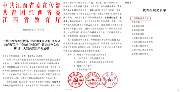 为深入学习和宣传习近平新时代中国特色社会主义思想和党的二十大精神,引导团员青年传承红色基因,弘扬革命精神,深入挖掘赣鄱大地的红色印记,努力打造更多具有标志性、展示性和影响力的江西红色文化品牌。近日,由中共江西省委宣传部、共青团江西省委和江西省教育厅举办的“创绘红色江西”首届红色文化IP设计大赛公布获奖名单。大赛分为红色吉祥物设计、文创产品设计和旅游纪念品礼品设计三个赛道,同时设立了最佳人气奖和优秀组织奖两个奖项。