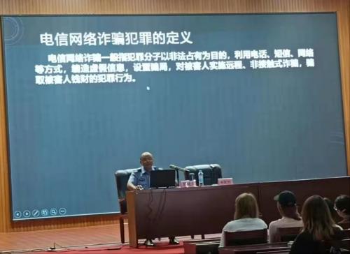 滕晓华以“安全四防”为切入点,与学生进行互动,现场氛围积极而热烈。他从四个方面向学生介绍了火灾、偷盗、诈骗、伤害的特点以及防范措施,提醒广大学生要提高防护意识,时刻保持警惕,保护好个人安全,不贪便宜、不乱转账,谨防生命财产受到伤害,同时他重点介绍了电信网络诈骗知识,分析了当前的诈骗类型,通过列举“冒充公检法”、“杀猪盘”和“冒充熟人”等典型案例对其进行深度剖析,以案释法、以法论事,让大家认清风险,防范未然。