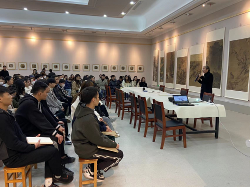 支林教授凭着自己的绘画积累的经验和丰富的历史知识,为师生们讲解及分析了美育对自身修养、美育对绘画的影响和如何把美育渗透进艺术创作,通过运用“中国银行”的设计以及“波普艺术”的事例,让师生们体会到设计与美育的关系;通过对古画的介绍,不忘初心感知古画中笔墨关系与情感关系的融合,教会师生如何运用古画的元素在设计创作中进行灵活运用,他鼓励学生进行高仿临摹,通过临摹借鉴将由时代感历史性的元素和现代结合成为一种新的设计或绘画模式,从中体会出一种文化的认可、一种文化的时代感。他希望师生们运用绘画形式通过体力、心态、韧性渗透到自己的设计作品和艺术创作中。