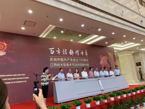 为庆祝中国共产党成立100周年,赣鄱耀中华--江西省大型美术书法诗词创作展于2021年6月29日在江西省美术馆开幕。参加开幕式的嘉宾有江西省委常委、省委宣传部部长施小琳、江西省人大常委会副主任马志武、江西省省政府副省长陈小平、江西省政协副主席刘晓庄以及省里有关厅局领导、文化艺术家代表和新闻媒体、各行业人士近百人。展览展出时间持续至7月13日。