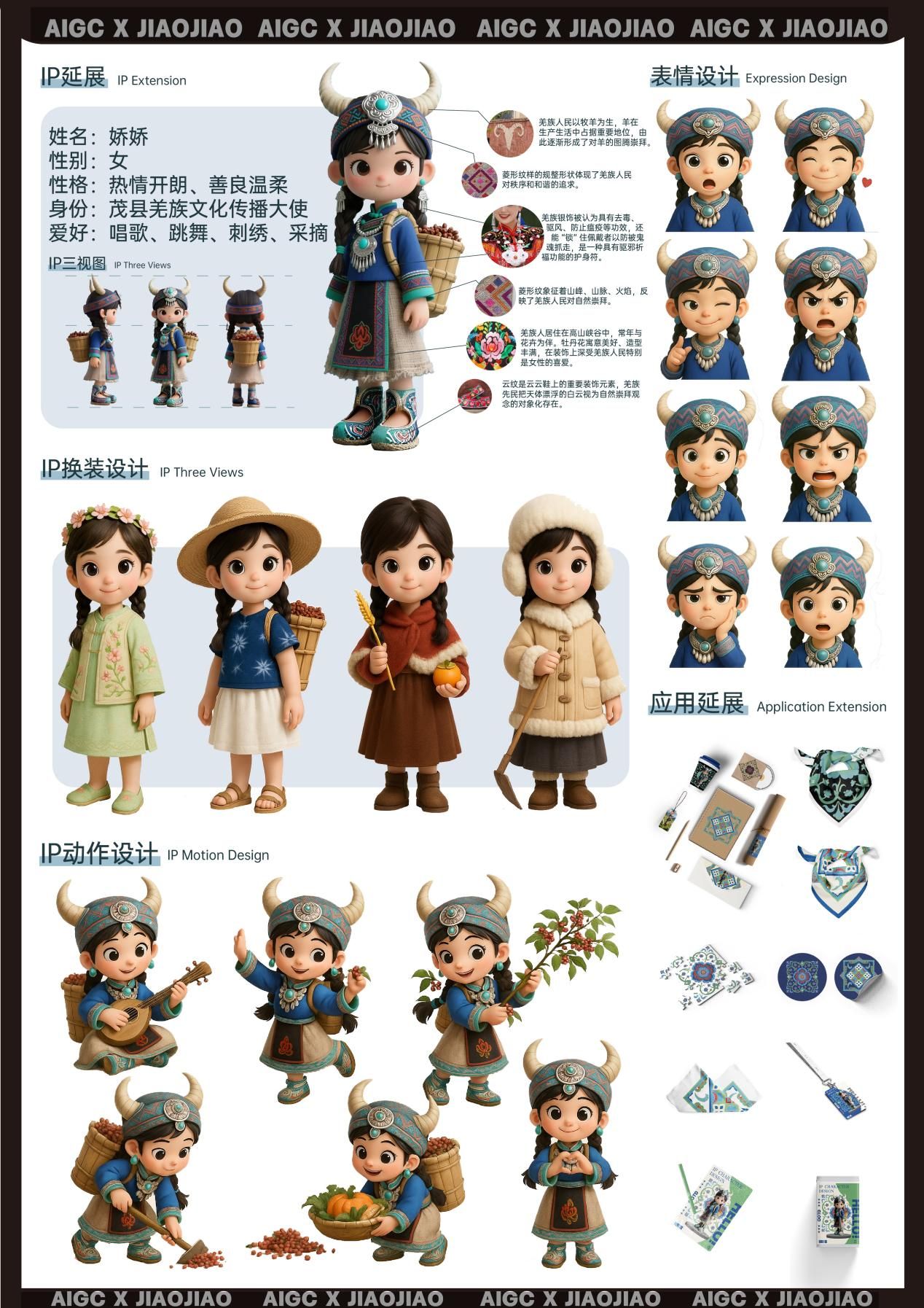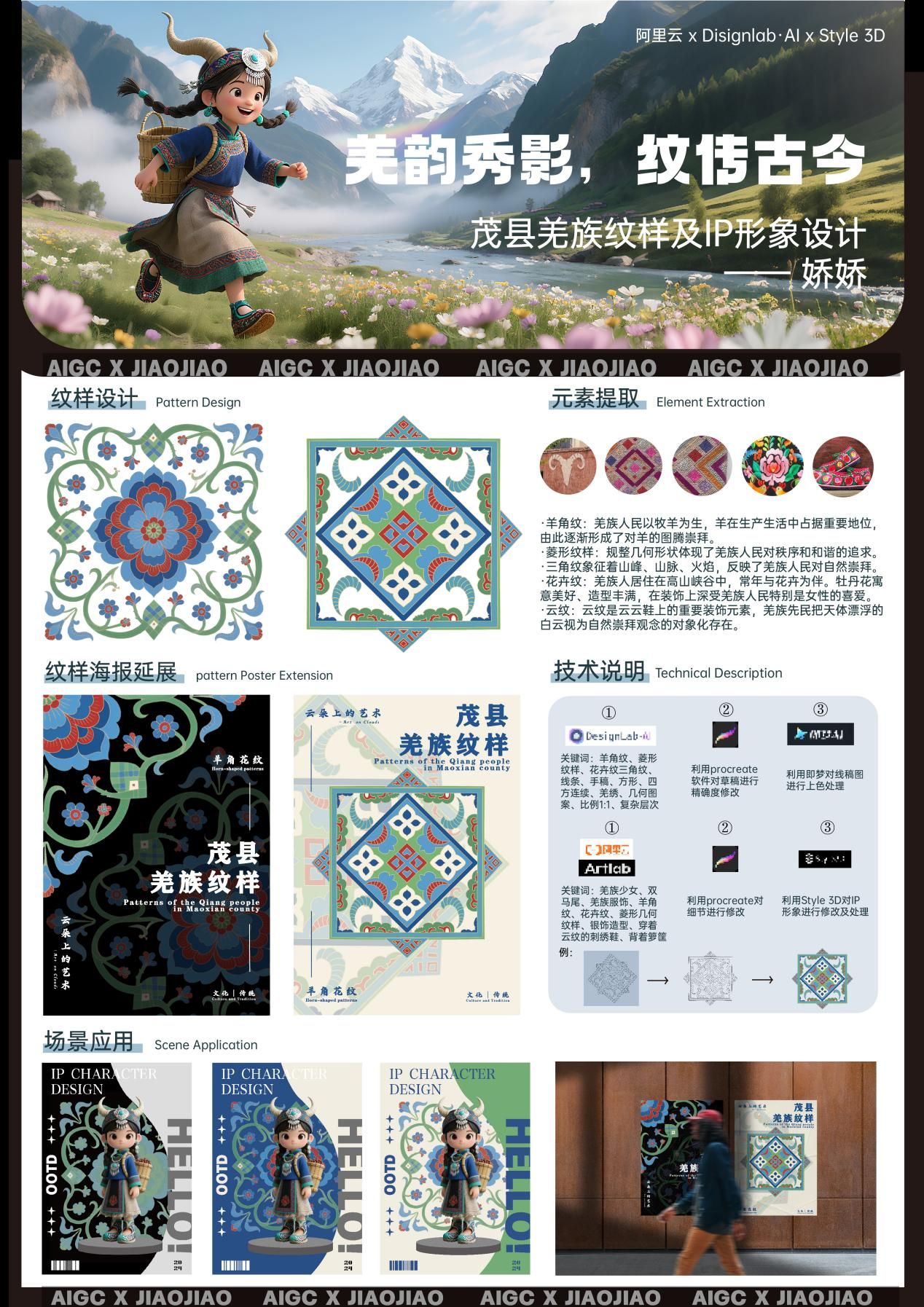 作品《羌韵秀影,纹传古今》紧扣赛事“纹生·万物”主题,深度挖掘羌族传统文化精髓,创新运用人工智能技术进行纹饰生成与设计,将古老的民族图案元素与现代审美、时尚应用场景巧妙融合。该作品展现了传统纹样在数字时代焕发的全新生命力,诠释了“人工智能+设计”赋能文化传承与创新的理念。