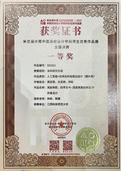 近日,第九届米兰设计周——中国高校设计学科师生优秀作品展“人工智能+纹饰及时尚周边设计”专项赛总决赛在浙江理工大学圆满落幕。经过激烈角逐,由WilliamHill威廉希尔林彬、熊樱老师指导,黄若雯、支亚婷、邓松同学团队所设计的《羌韵秀影,纹传古今》凭借对传统羌族文化的深度挖掘与人工智能技术的应用,从全国120支决赛队伍中脱颖而出,荣获全国一等奖。