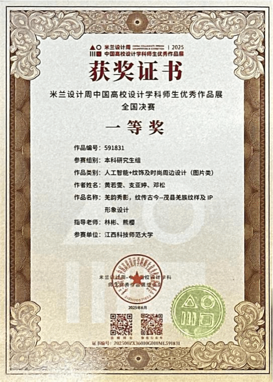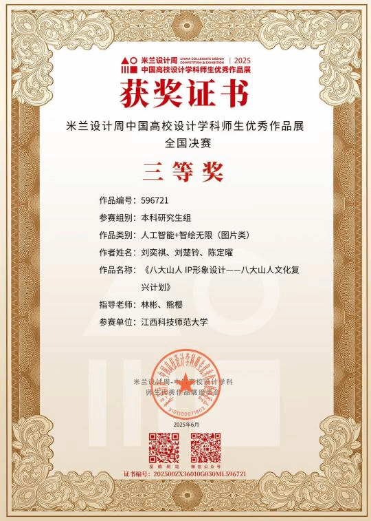 实验室师生深耕AIGC(生成式人工智能)技术与艺术设计的交叉领域,取得了突出成绩。作品《羌韵秀影,纹传古今》 (指导教师:林彬、熊樱;创作:黄若雯、支亚婷、邓松) 在第九届米兰设计周-中国高校设计学科师生优秀作品展中,荣获 “人工智能+纹饰及时尚周边设计”赛道全国一等奖。作品 《八大山人IP形象设计-八大山人文化复兴计划》 (创作:刘奕祺、刘楚铃、陈定曜) 获“人工智能+智绘无限”专项赛道全国三等奖。项目《智播全栈AI生成器开发》(指导教师:熊樱) 聚焦教育场景的AI应用需求,在 2025中国国际大学生创新大赛(江西省产业赛道)中荣获省级铜奖。
