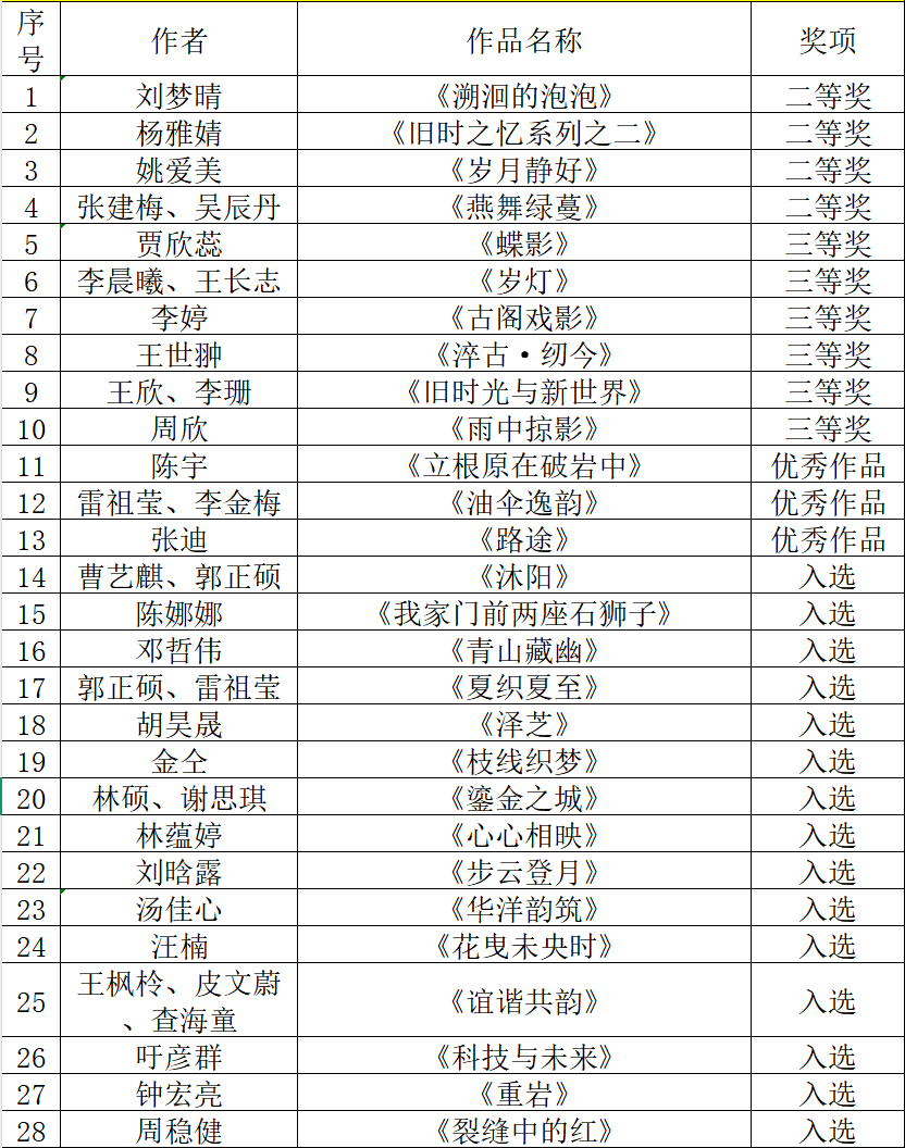 近日,第十一届江西漆画作品大赛复评结果揭晓。我院师生凭借出色的艺术创作能力与对漆画艺术的深刻理解,在激烈角逐中脱颖而出,荣获二等奖4项、三等奖6项、优秀奖3项,另有15件作品成功入选。