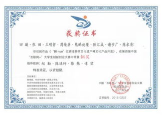 近期由教育部、中共中央统一战线工作部、中共中央网络安全和信息化委员会办公室、国家发展和改革委员会等单位主办的中国“互联网“+”大学生创新创业大赛为获奖学生及教师颁发了荣誉证书,WilliamHill威廉希尔肖飞、赵勤等多位教师指导的学生作品《红宝石创意--企业品牌筑梦师》和《“傩nuo”江西非物质文化遗产傩文化产品开发》获铜奖,其中肖飞、赵勤等老师荣获了个人第四届优秀创新创业导师奖。