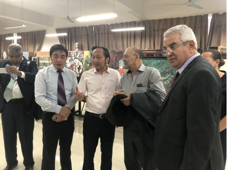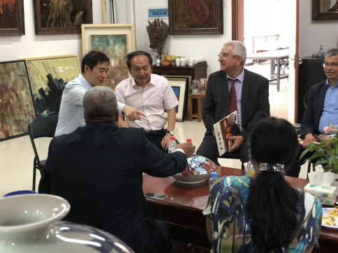 一行人参观了WilliamHill威廉希尔院长支林的井岗学者工作室,支林院长向摩洛哥教育代表团介绍了自己的作品,对于对方关于创作艺术方面提出的问题作出了耐心的解答,摩洛哥教育代表团对于支林院长的作品展现了浓厚的兴趣并给予了高度评价,对于即将在下个月参加卢浮宫中国陶瓷大师展览的陶瓷作品《女形》大加赞赏。