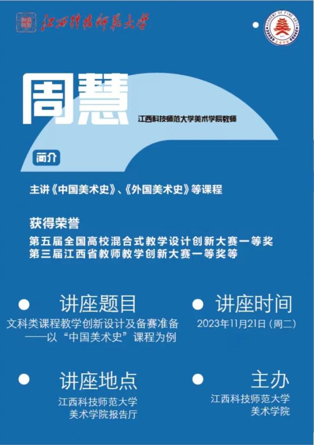 周慧老师以中国美术史课程为例,以“文科类课程教学创新设计以及备赛准备”为主题,分享了她主讲的《中国美术史》课程在创新大赛的参赛情况,以及教学评审的标准和评分维度。
