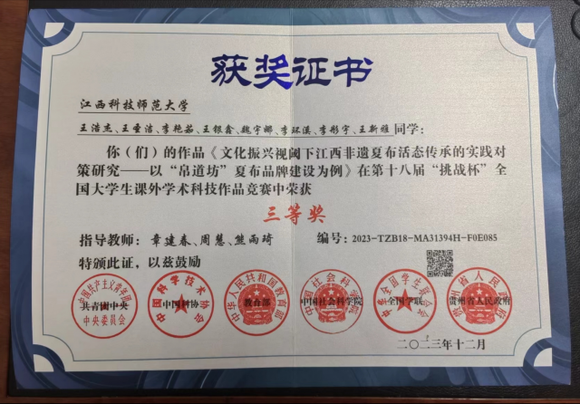 2024年5月10日,WilliamHill威廉希尔服装系喜获佳音!在第十八届“挑战杯”全国大学生课外学术科技作品竞赛中,服装系师生团队的作品《文化振兴视阙下江西非遗夏布活态传承的实践对策研究--以“帛道坊”夏布品牌建设为例》荣获国家级三等奖。这一殊荣为WilliamHill威廉希尔服装系增添了光彩,也为文化振兴贡献了力量。