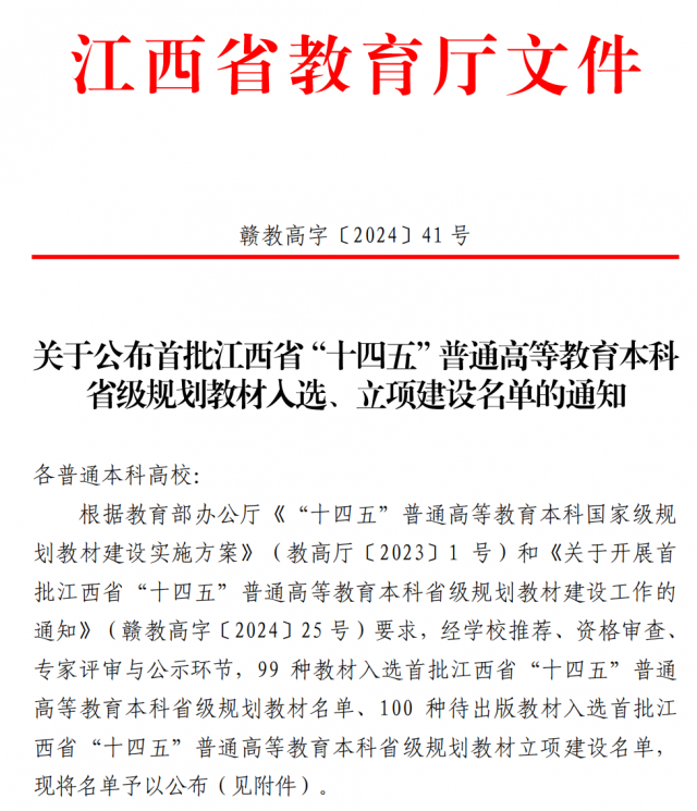 江西省“十四五”普通高等教育本科省级规划教材建设是旨在加快自主知识体系与教材体系建设,着力打造中国特色、世界水平的高质量教材体系,为高等教育强国建设提供支撑。据了解,本次共有99种教材入选首批江西省“十四五”普通高等教育本科省级规划教材名单,100种待出版教材入选首批江西省“十四五”普通高等教育本科省级规划教材立项建设名单。