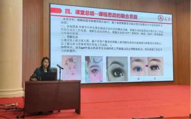 服装与服饰设计系卢苌听老师以《课程思政之我见-----< 化妆与发型设计>的教学案例设计思路》为题,介绍了该门课程在课程思政上的积极探索和取得的成效。卢老师从什么是课程思政,谈到课程思政的核心,从课程思政教学范例,谈到专业课与思政的融合思路。她的讲解深入浅出地分析了如何在《化妆与发型设计》课程中融入思政元素,使得专业课程与思政教育相得益彰。在教学过程中,卢老师注重将思政元素与专业知识相结合,让学生在掌握专业技能的同时,也能提升思想认知水平。同时,她提出还要加强实践环节的设计,让学生在实践中感受思政教育的力量,增强社会责任感和使命感。