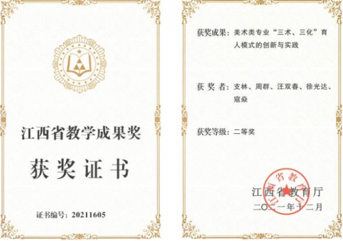 5 | 美术类专业“三术、三化”育人模式的创新与实践 | 江西省教学 成果奖 | 省级二等奖 | 2021年 |