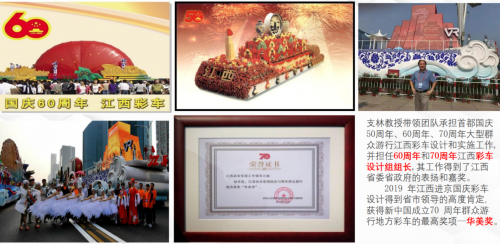 秉承艺科融合的理念,学科团队承担首都国庆50周年、60周年大型群众游行江西彩车设计和实施工作,并担任60周年和70周年江西彩车设计组组长,得到了江西省委、省政府的表扬和嘉奖,被评为荣获首都庆祝中华人民共和国成立60周年游行活动突出贡献专家,70 周年群众游行地方彩车的最高奖项——“华美奖”。