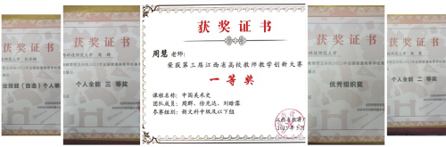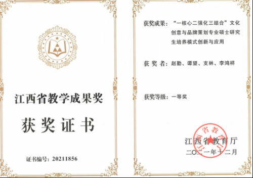 2 | “一核心二强化三结合”文化创意与品牌策划专业硕士研究生模式创新与应用 | 江西省教学 成果奖 | 省级一等奖 | 2021年 |