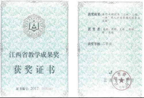 4 | 漆艺术研究生“三双、二维、一体”的人才培养模式探索与实践 | 江西省教学 成果奖 | 省级二等奖 | 2017年 |