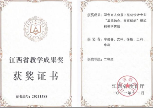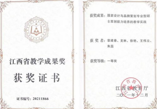 1 | 服装设计与品牌策划专业型硕士双创能力培养的教学实践 | 江西省教学 成果奖 | 省级一等奖 | 2021年 |