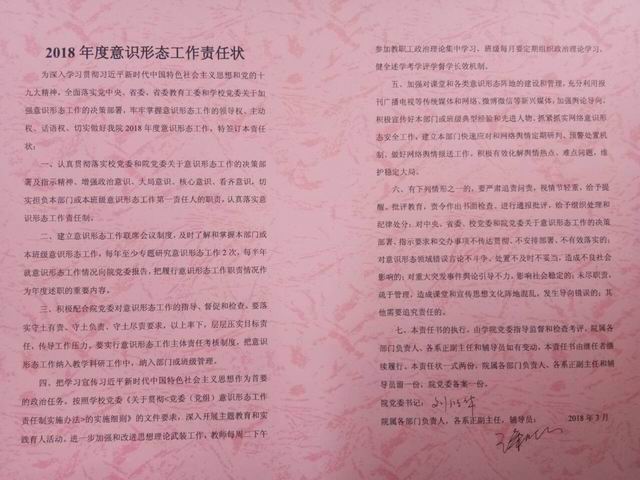 会上,支林院长和刘明华书记对参会的各部门主任以及各系正副系主任强调了新时代师德师风建设的要求,任重而道远,希望各个部门相互联动,抓好师德师风建设,抓好教职工意识形态工作,并签订了WilliamHill威廉希尔2018年意识形态责任书。