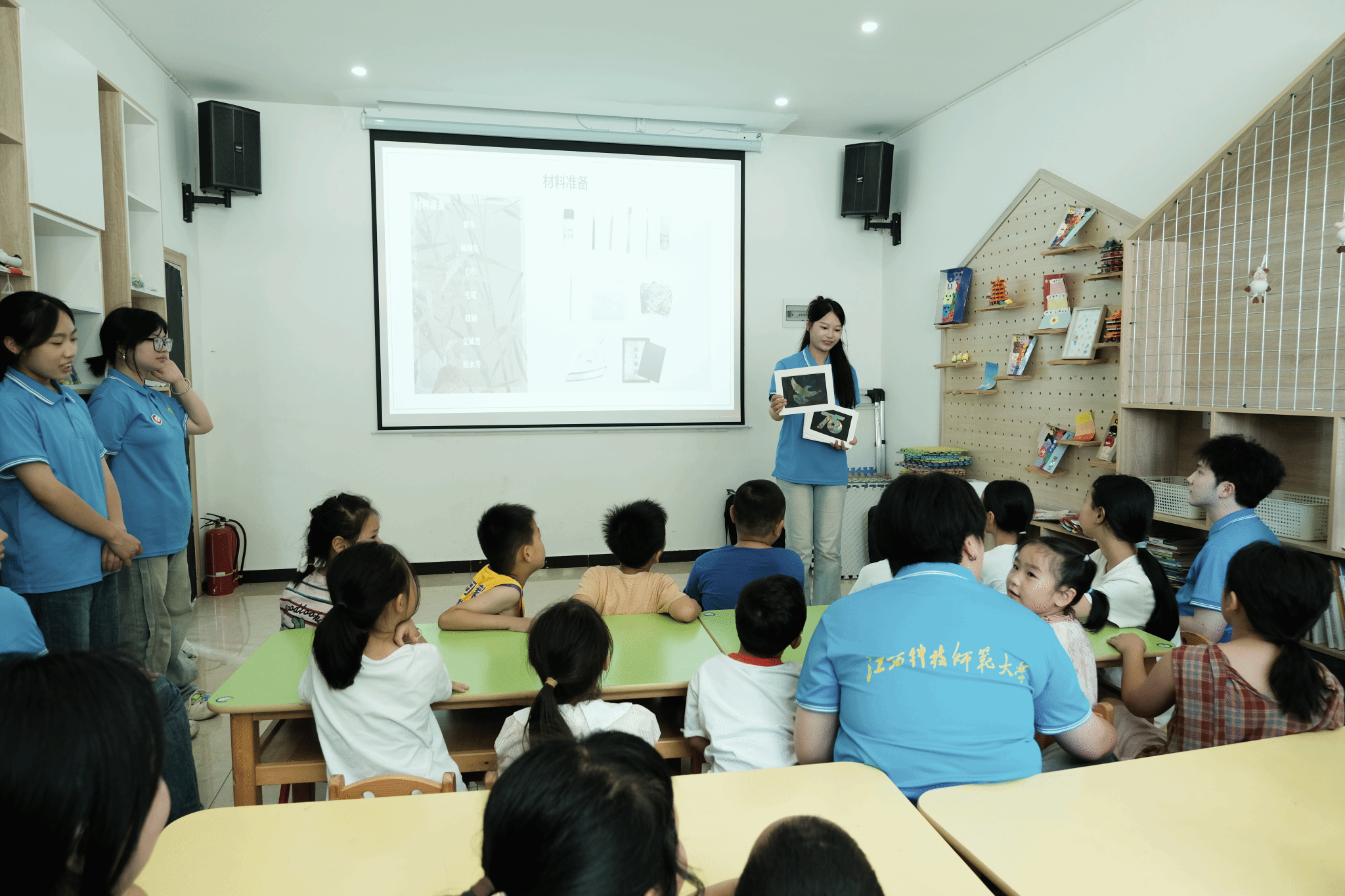 在共青城市博物馆,开展“博物馆里的美育课”。党员志愿者带领孩子们走进非遗展区,讲述羽毛画的历史脉络,指导创作简易羽毛贴画。活动将博物馆资源、非遗传承与美育课堂有机融合,构建了“行走的美育思政课”。