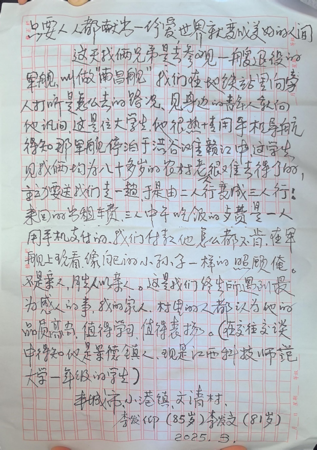 去年11月,两位老人从丰城来到南昌参观“南昌舰”,当时在地铁上由于不熟悉路线及方位,迷失了方向,于是向身边的青年人询问,张三省同学在告知老人乘车方向、具体路线后,考虑到老人高龄、路线又不熟悉,于是主动陪同两位老人参观,并且支付了车费,还热情的请老人吃了午饭,参观结束后将他们送至车站。