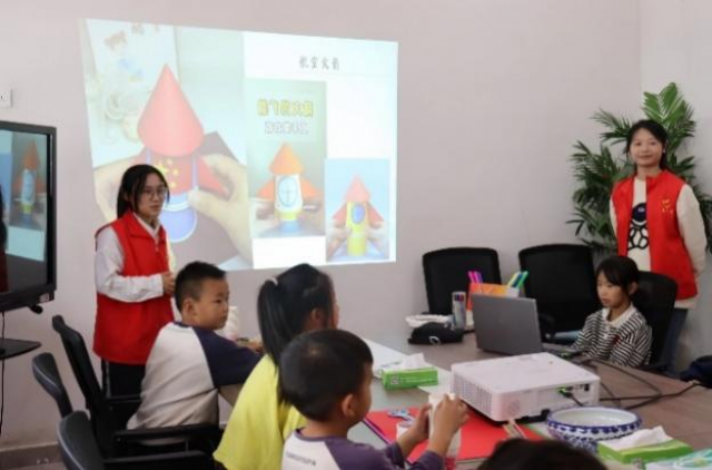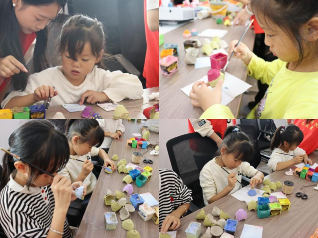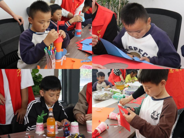 随后,志愿者们根据孩子们的兴趣进行了手工小组分组,第一组利用废弃鸡蛋托,以涂鸦方式制作“年年有鱼”饰品,让孩子们了解中国传统吉祥祝福语,培养孩子们对中国传统文化的热爱与传承;第二组则利用废弃卡纸等材料制作“航空火箭”,培植孩子们崇尚科学、热爱科学的精神。