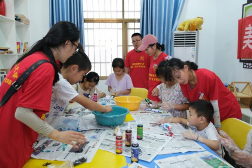 “修己惠人,笃行慎远”,7月13日,队员们结合专业特长,以传统文化特色为背景,强化美育发展为目的,开展了一堂别出心裁的美术课。课堂内容异彩纷呈,为乡村孩子们带来了中国传统非遗文化工艺——扎染以及剪纸艺术。绚丽的色彩在他们的独特视角中不断碰撞,激荡出艺术的绝响,不同的扎结手法与染色方式,裁剪的不同方法和形状,都引导着孩子们回归到他们对美的直觉,温润他们的心灵。在带领孩子们领略艺术的不同风光之际,也激发起他们对美术的浓厚兴趣,寓情于绘,延续美育发展新脉络,传承中国传统文化。