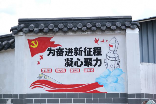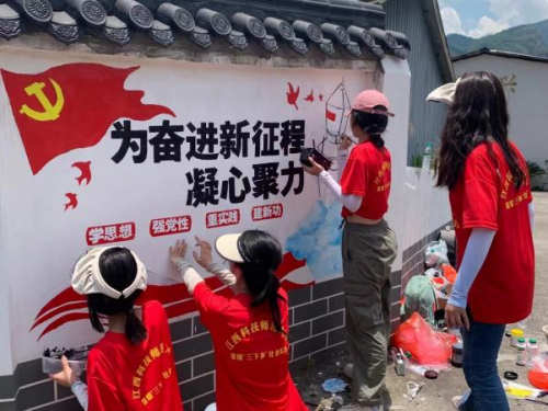 7月14日,实践队来到草林镇的唐虞村开展了墙绘实践活动,为乡村艺术添彩,为美丽乡村建设贡献力量,为唐虞村增添了一道靓丽的风景线。墙绘以“为奋进新征程凝心聚力”为主题,以颜料为载体,以画笔为工具。