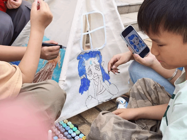 家长和孩子们以“自然”“家园”“梦想”为主题在白色帐篷上进行创作,孩子们充分发挥对大自然的想象,用稚嫩的笔触描绘花朵、星空和小动物,志愿者则从构图、配色等角度提供建议。