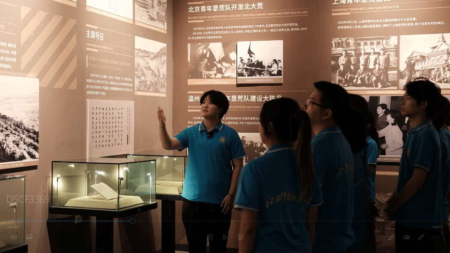 在共青城博物馆,一张张老照片、一件件珍贵文物无不诉说着当年垦荒队员“下定决心向困难进军,把荒山变成良田”的艰苦创业历程,他们住草棚、啃窝头,凭借简陋工具,用青春和汗水把荒滩野岭开辟成了一片新的天地。通过博物馆的场景还原,大学生们身临其境,真切地感受那段波澜壮阔的垦荒历史。