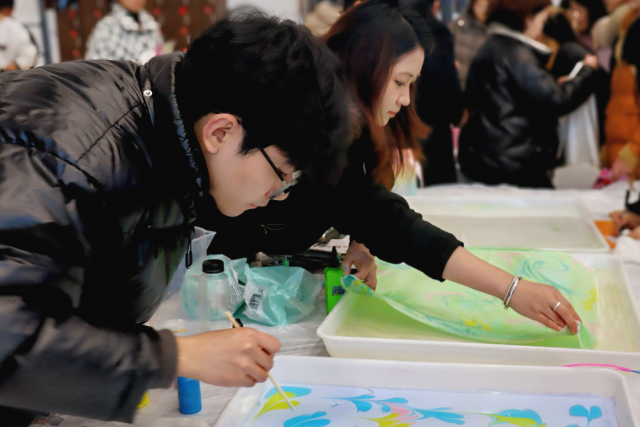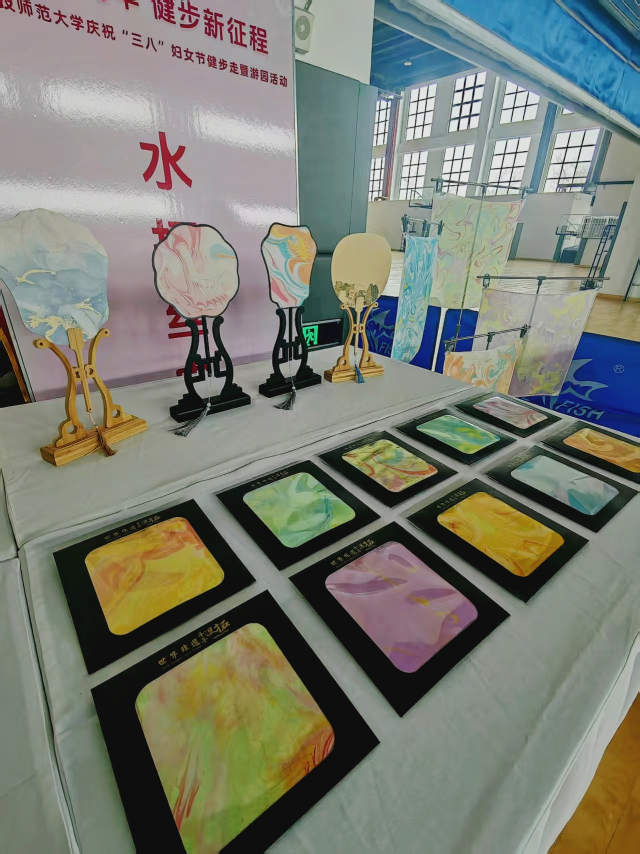 “非遗水拓绽芳华”活动则以古老的水拓画技艺为核心,带领女教职工体验“入水成花,拓丝成画”的奇妙创作。活动特邀学院王艳老师及研究生团队现场指导,通过讲解水拓画的历史与技法,揭开这项源于唐代的“水中魔法”面纱。参与者亲手调配颜料、拨动水面纹路,将丝巾浸入水中拓印图案,最终收获独一无二的艺术品。