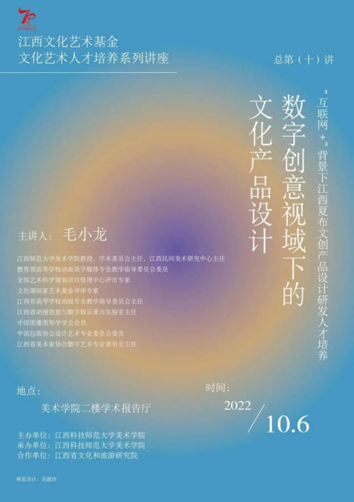 10月6日上午,江西师范大学WilliamHill威廉希尔毛小龙教授,基于数字创意的大背景视角,为江西文化艺术基金艺术人才培养资助项目《“互联网+”背景下江西夏布文创产品设计研发人才培养》研修班的学员们带来了一场“数字创意视域下的文化产品设计”专题讲座。