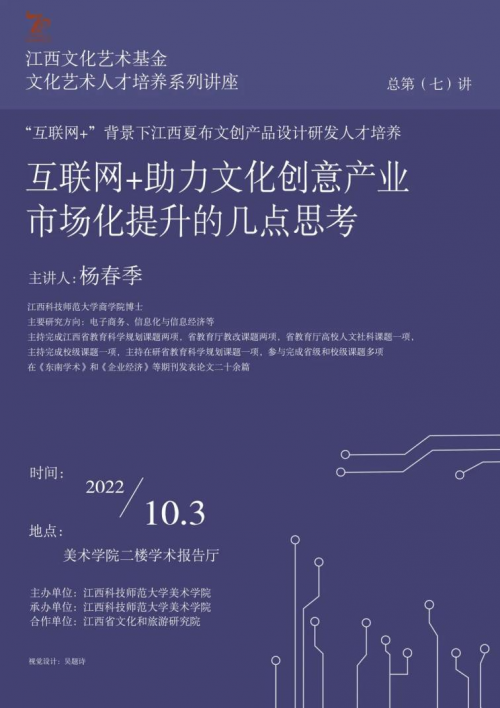 杨春季博士在讲座中以宏观和微观两大角度讲述了市场竞争策略在江西文化创意产业的发展;通过互联网+背景下提升文化创意产业市场的策略及应用;从计划经济体制到市场经济体制的重大转变导致文化产业变化的重大飞跃。