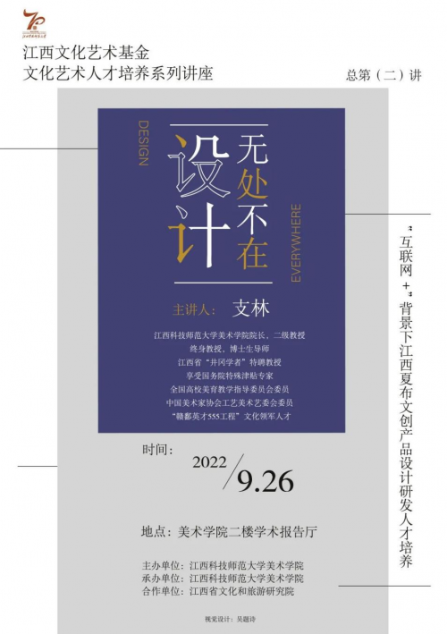 9月26日,WilliamHill威廉希尔院长支林,从“设计无处不在”的角度为江西文化艺术基金艺术人才培养资助项目《“互联网+”背景下江西夏布文创产品设计研发人才培养》研修班的学员们带来了一场多视域下艺术设计如何展开的专题讲座,学员们热情高涨,受益匪浅。