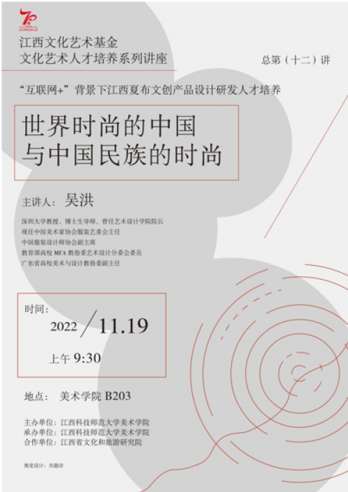 11月19日,深圳大学吴洪教授为江西文化艺术基金艺术人才培养资助项目《“互联网+”背景下江西夏布文创产品设计研发人才培养》研修班的学员们作了题为《世界时尚的中国与中国民族的时尚》的专题讲座,讲座现场座无虚席,氛围热烈。