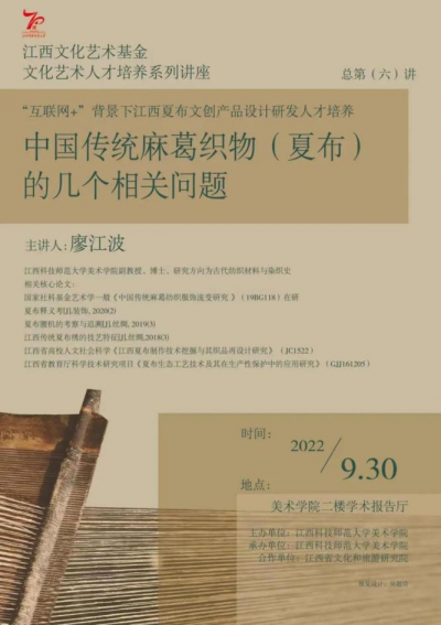 9月30日,WilliamHill威廉希尔副教授、博士廖江波,从传统麻葛植物的起源以及面料特性的角度分析,为江西文化艺术基金艺术人才培养资助项目《“互联网+”背景下江西夏布文创产品设计研发人才培养》研修班的学员们带来了一场传统视角下有关夏布起源及其释义的专题讲座。
