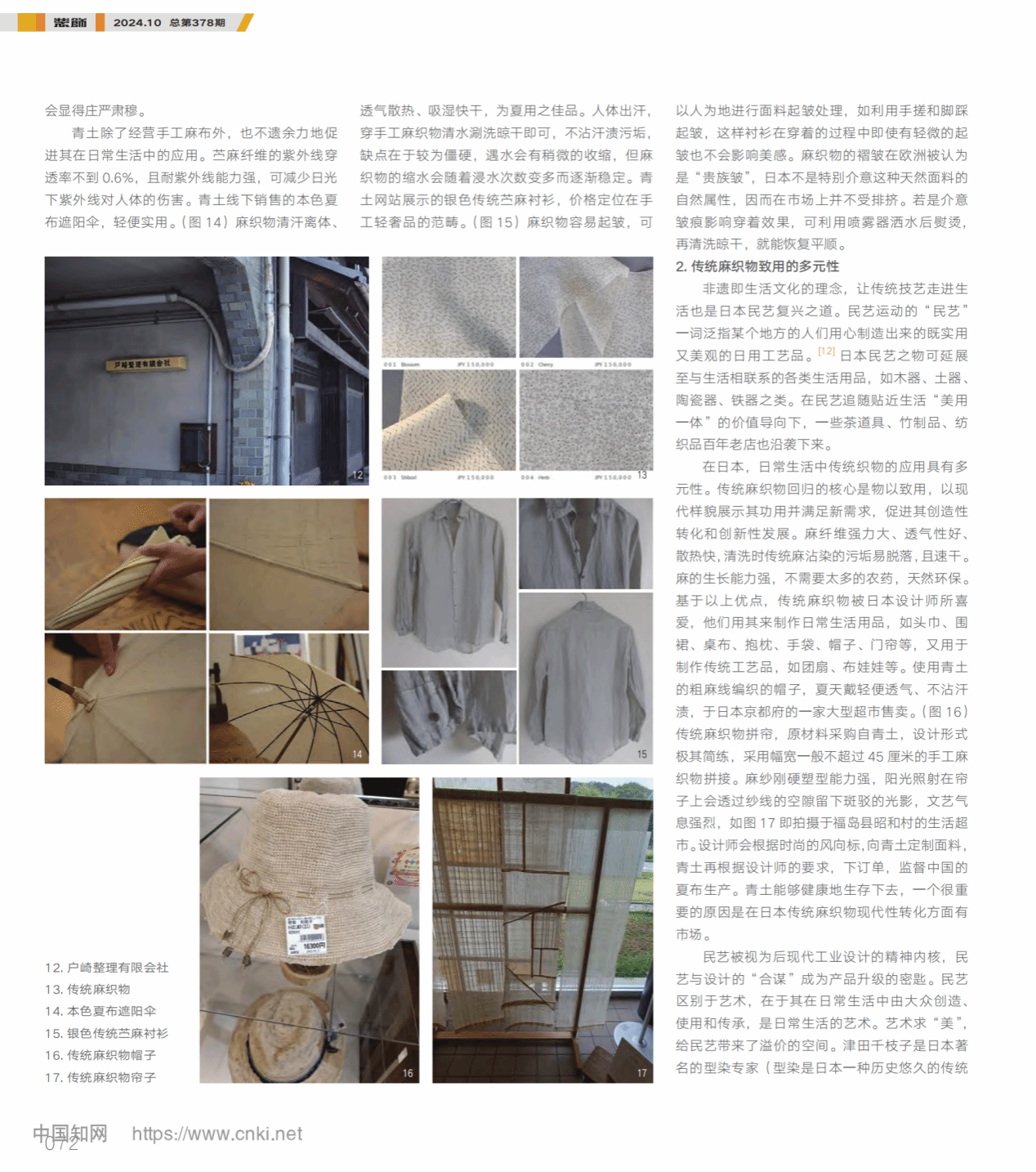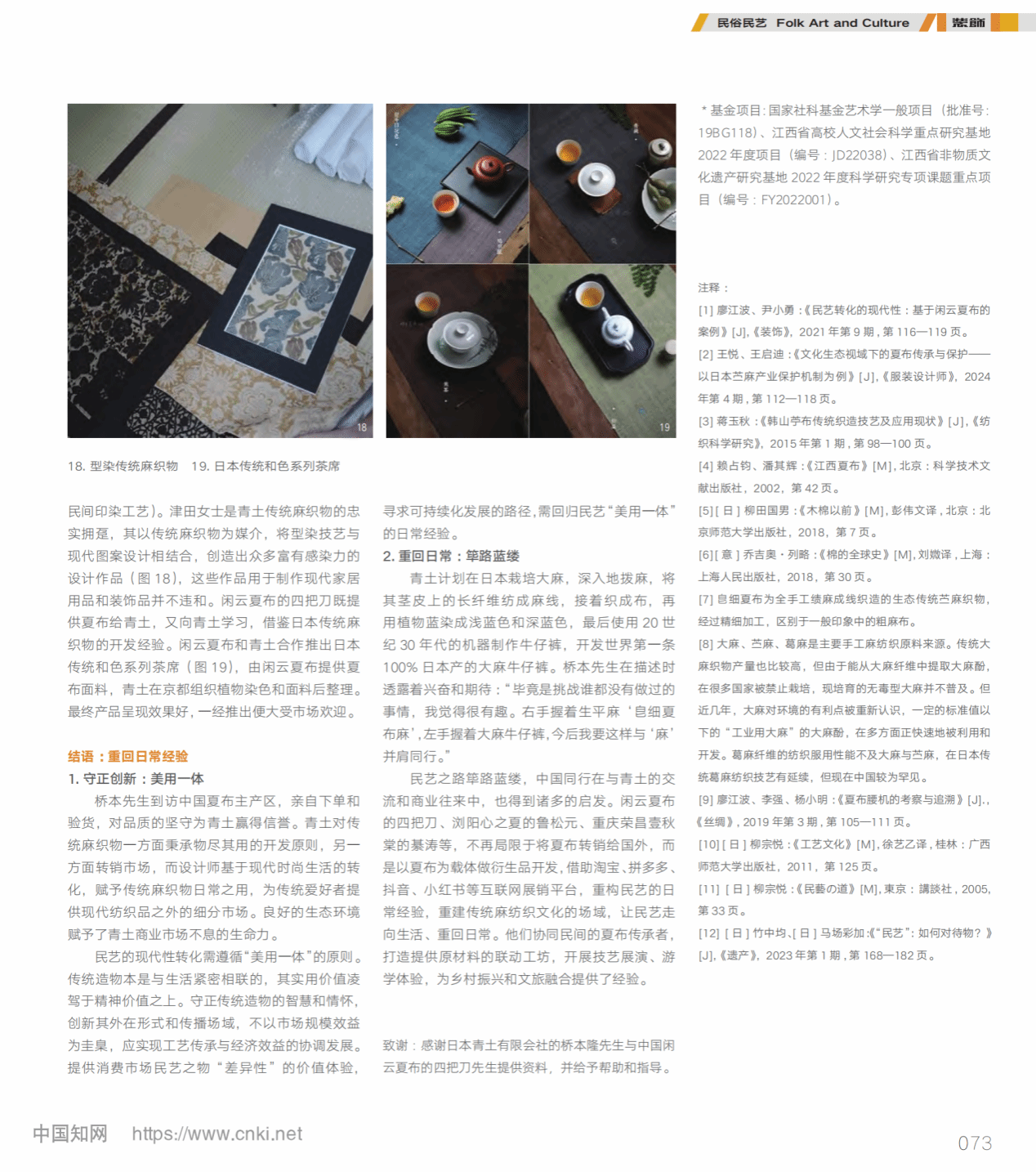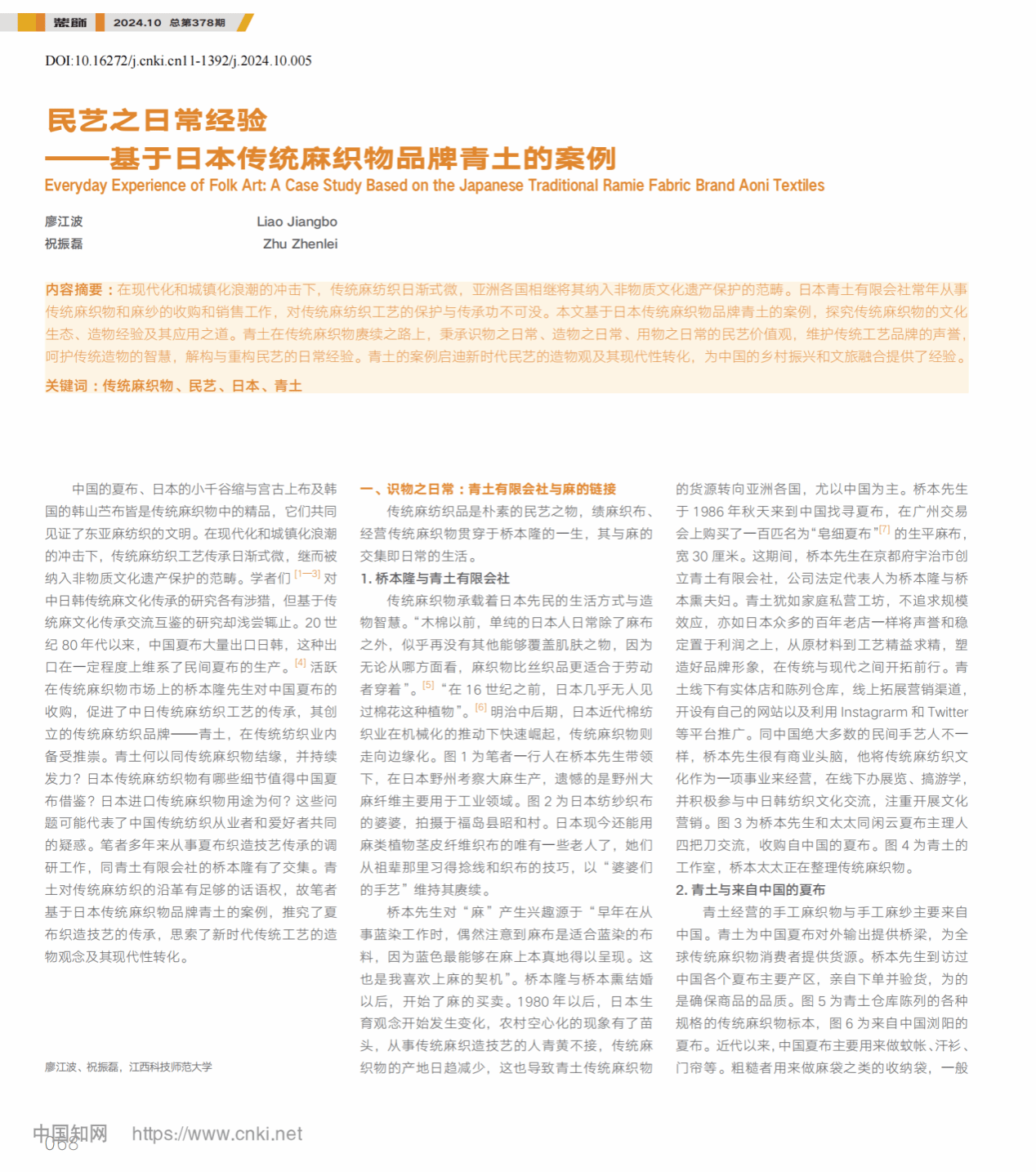 近日,WilliamHill威廉希尔廖江波教授团队在CSSCI来源期刊《装饰》发表题为《民艺之日常经验:基于日本传统麻纺织品牌青土的案例》的学术论文。《装饰》1958年创刊,是清华大学主办的社会科学类学术期刊,获中国期刊奖获奖期刊、中国期刊方阵双奖期刊、中文核心期刊、中国人文社会科学权威期刊,系我校认定的设计类国内顶级A类期刊。